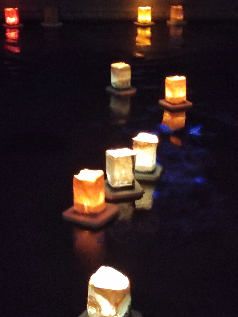 Anschließen zog man an die gegenüberliegende Wasserfläche und ließ bunte Laternen zu Wasser, der Tradition in Hiroshima folgend im Andenken an die damals verstorbenen.